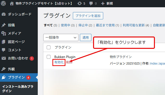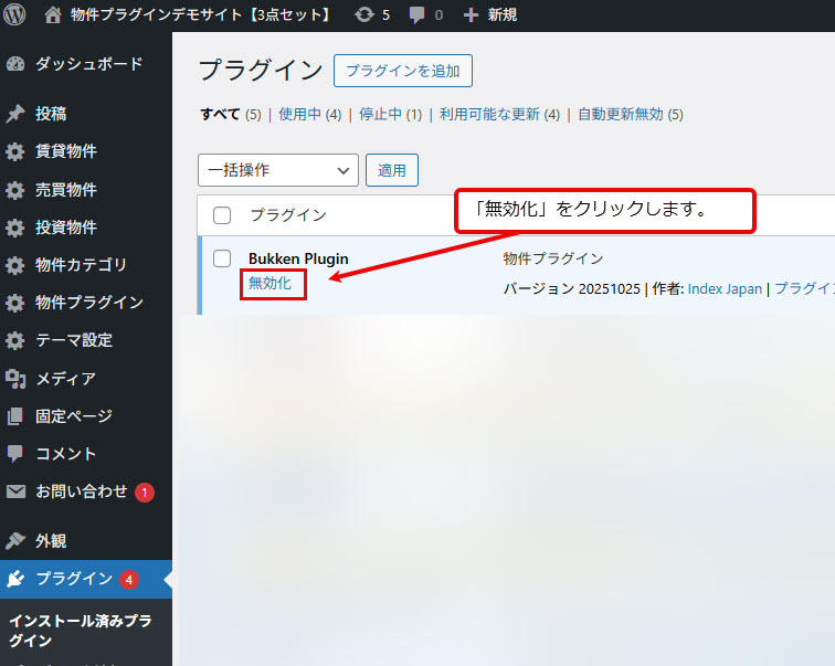 管理画面で Bukken Pluginを無効化して、すぐに有効化する